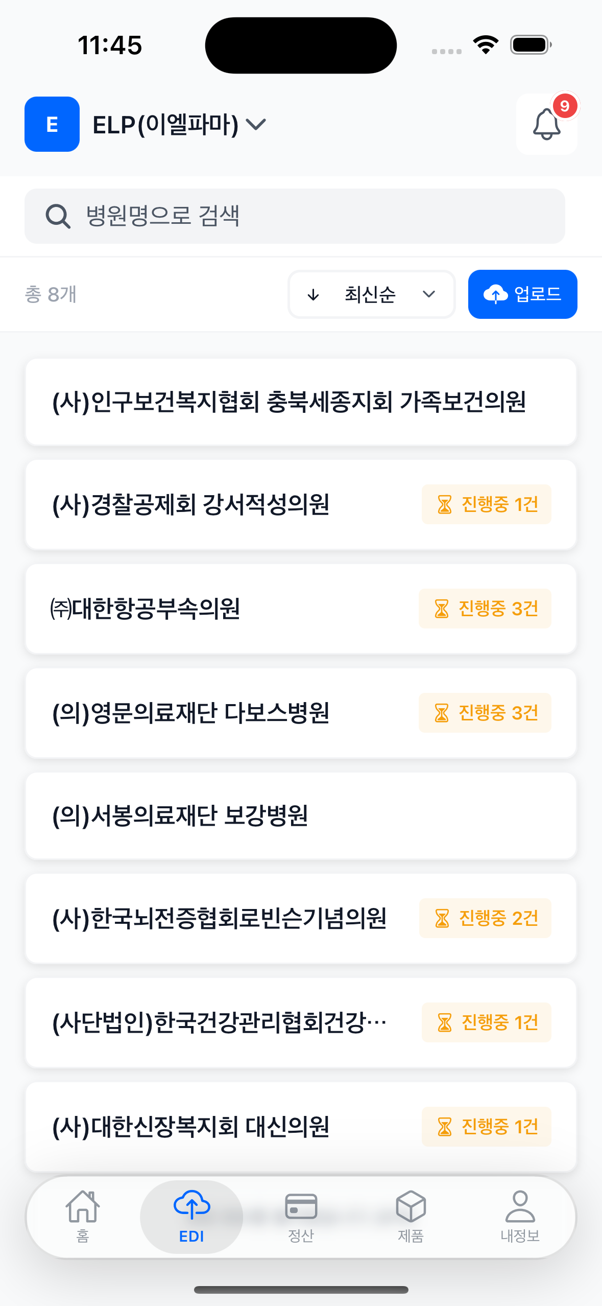 EDI 제출 현황, 정산 현황, 병의원 이슈를 한눈에 확인하는 메인 대시보드입니다.