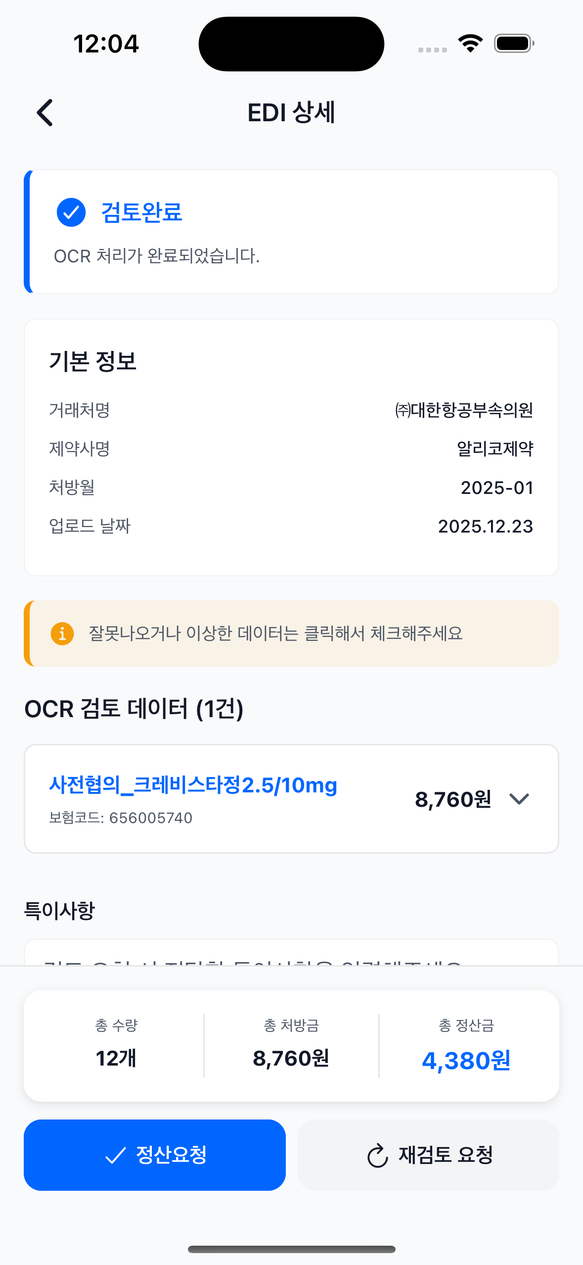 OCR로 자동 추출된 데이터를 검토하고 정산 요청까지 한 화면에서 처리합니다.