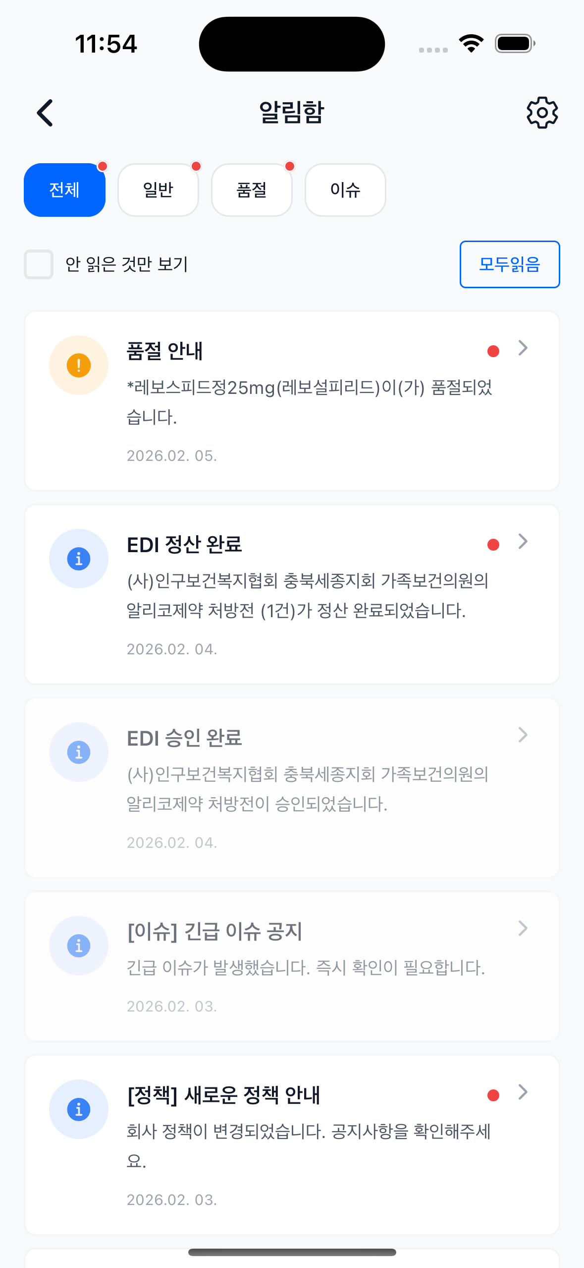 품절, EDI 정산, 이슈 등 카테고리별 알림을 통합 관리합니다.